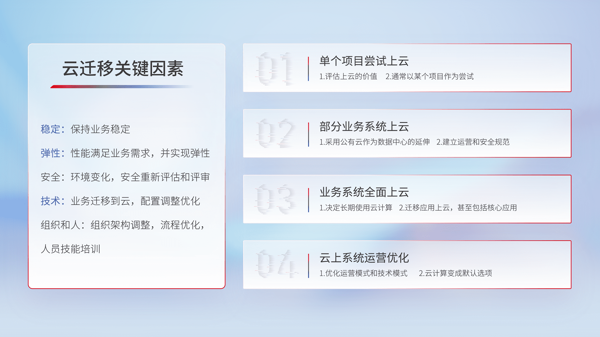 结合实际业务,,,从规划设计、、、、云平台选型、、、云原生改造、、、、数据迁移、、、、集成交付,,,,迁移全过程为客户识别最佳上云路径,,做好风险识别管理,,,设计网络架构、、、、身份权限、、安全审计合规、、、操作审计、、、、日志审计、、监控告警策略、、、多站点容灾设计等,,,对云上基础设施进行整体规划,,,,提升IT治理水平,,,,以满足弹性、、、、高可用、、、、高性能的需求。。。
