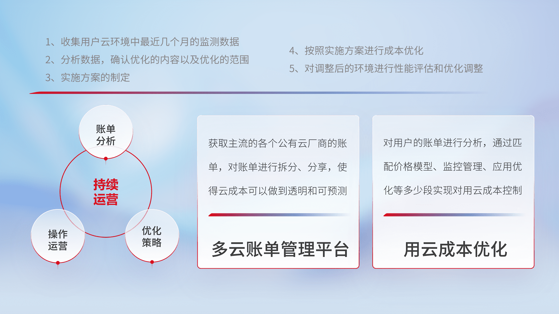 通过多云纳管,,以统一的资源数据模型把客户的云资源进行抽象和封装,,,进而实现对多云资源的统一操作,,,,保障云资源管理的可靠性、、、稳定性与可用性。。量身定制化运维内容,,配置、、、开发运维、、、补丁管理、、、备份、、、监控、、认证和访问管理、、、、审计和日常巡检等,,,,保障在用云过程中的可靠度,,稳定度以及高可用率。。。。